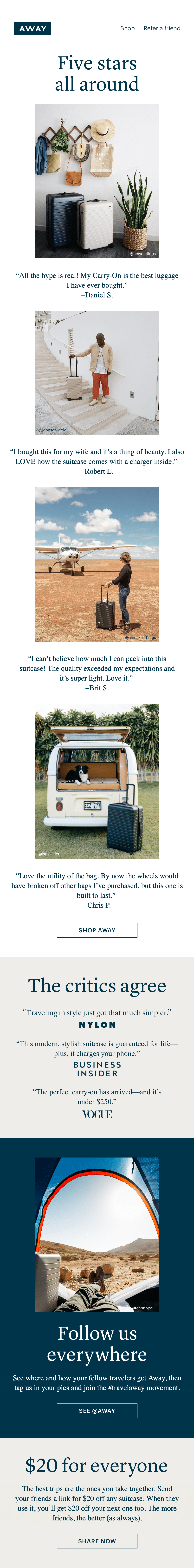 Additionally, Away shares their social media handles in this email so subscribers can get in on the action. This ensures the user-generated content keeps coming.