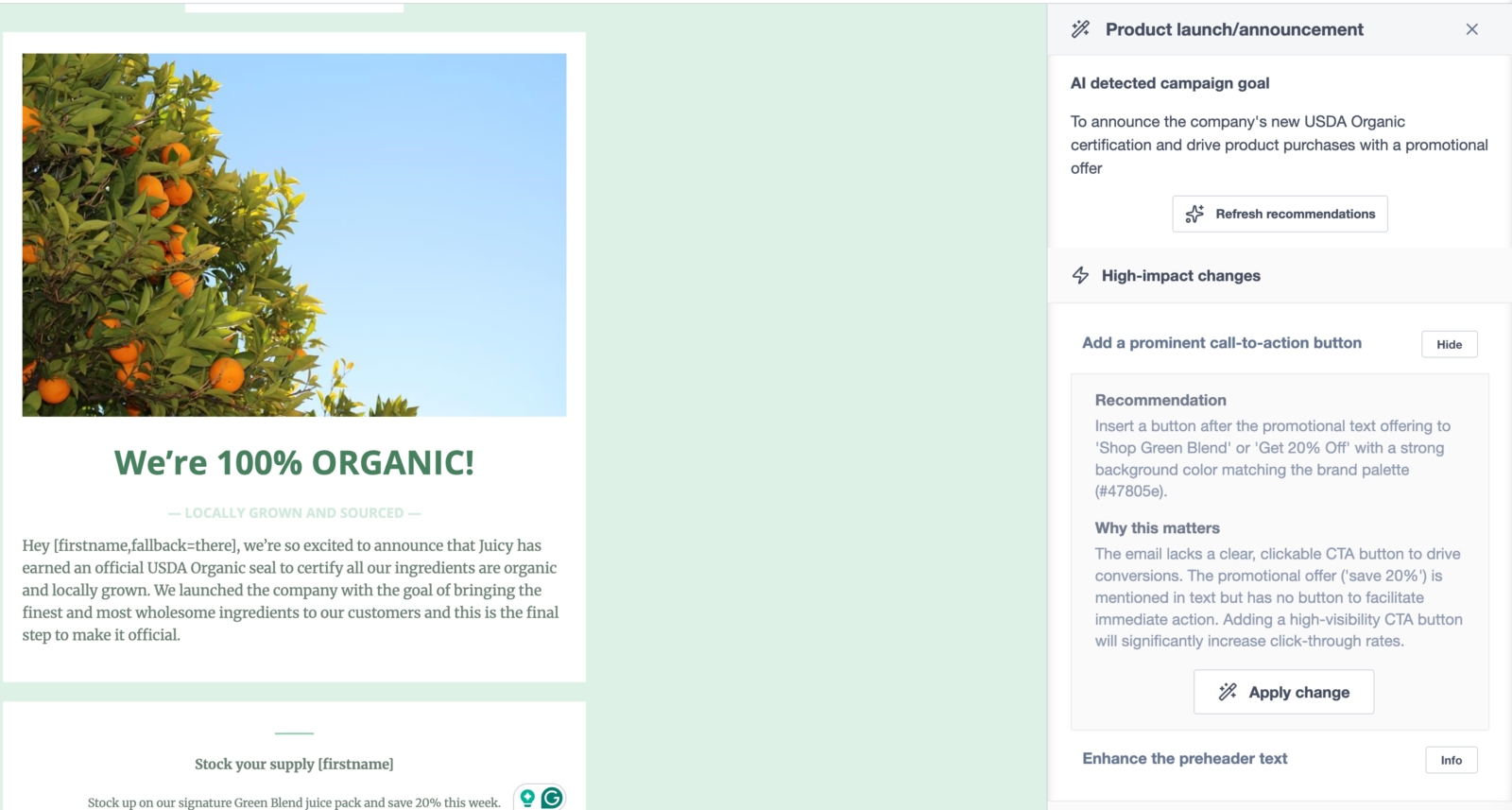 AI help shouldn’t mean giving up creative control. AI Email Booster makes recommendations, but you decide what gets applied.