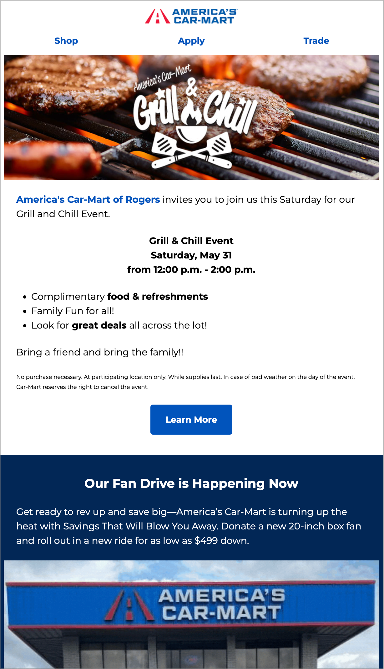 America's Car-Mart (“Car-Mart”) operates over 150 car dealerships in 12 states and is one of the largest publicly held automotive retailers in the U.S. Since 1981, Car-Mart has served its communities by selling quality used vehicles and offering affordable financing solutions. Today, Car-Mart’s 2,200+ associates provide Peace of Mind to more than 100,000 active customer accounts.